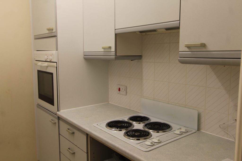 Kitchen 235cm x 230cm A range of work surfaces, cupboards, and draws, under work surface refrigerator, electric 4 ring hob, with eye level oven. Double sink unit.