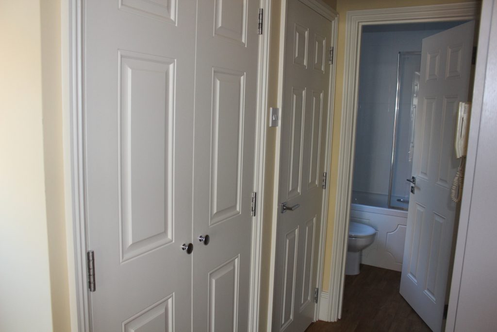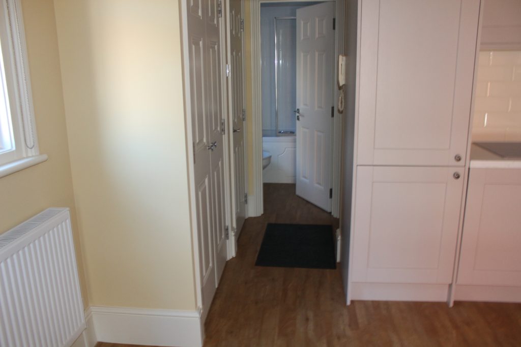 This modern studio flat has been refurbished with new kitchen and bathroom. Located in The centre of Meads Village and close to the seafront. The studio room is spacious with a good quality laminate flooring, there is a radiator and French doors lead out to the fire escape. The open plan kitchen has a range of units and work surfaces, integral fridge/freezer, integral washer dryer, hob with oven under and extractor fan. There are two fitted cupboards in the hall. The bathroom has a bath with shower over, hand wash basin toilet and chrome heated towel rail.